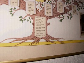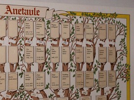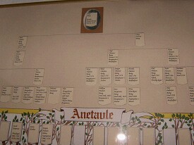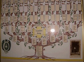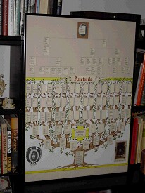 Jeg besluttede nu at vende anetavlen i rammen, så der yderligere blev plads til 4 generationer af slægten Bang ovenover. Der røg et par kviste og egeblade i siderne under processen, men jeg fik til gengæld en rigtig god oversigt over denne meget omfattende slægt. Da de samme navne ofte går igen i en stor slægt, er det en hjælp at have en sådan tavle hængende, når man skal finde ud af hvilken Bang det nu er man arbejder med og hvordan denne er beslægtet med de andre Bang´er.